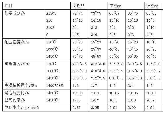 由于我國高爐出鐵溝過(guò)去一般用黏土熟料、焦粒、廣西白泥和焦油瀝青搗制而成的耐火澆注料,通鐵量少,修補頻繁,勞動(dòng)強度大,污染環(huán)境;后來(lái),采用Al2O3 ~ SiC ~ C 質(zhì)搗打料,通鐵量顯著(zhù)提高,但勞動(dòng)強度大;到80年代后期,開(kāi)發(fā)了Al2O3 ~ SiC ~ C質(zhì)超低水泥耐火澆注料。該類(lèi)澆注料一般用致密白剛玉、亞白剛玉、棕剛玉、優(yōu)質(zhì)高鋁熟料、碳化硅和鱗片石墨等材料,再摻加超微粉、結合劑和外加劑配制而成。其性能,見(jiàn)下表。表中,高中檔產(chǎn)品適用于大、中型高爐出鐵溝,中低檔產(chǎn)品則適用于中、小型高爐出鐵溝或渣溝。